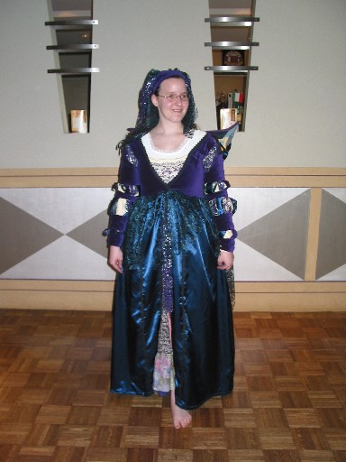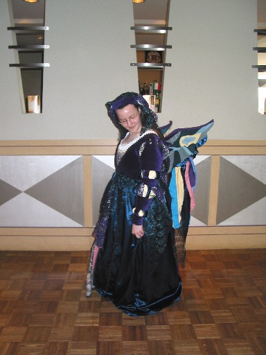 I called this particular outfit rags, tags, and velvet. Most of the shredded stuff, and the patchwork skirt, are real silk or lace, the bodice is velveteen. The cut and sleeves are Renaissance, the materials and application are, well, not. The thing that tends to catch the most attention is that the wings flutter when I move my shoulders. |