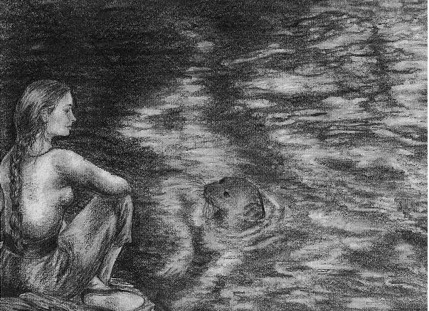 Sisters (9" x 6", pencil) The girl looking into the water is modelled on my dear friend Holly Finnen, who is, to all intents and purposes, my sister (and whose hair is considerably longer than that). The water and seal are gleaned from a trip to the Chicago Oceanarium. Unfortunately, that means the seal's a harbour seal - in proper folklore, selkies were supposed to be the larger grey seals, and the harbour seals only animals. (No, I'm never anal about these things). |